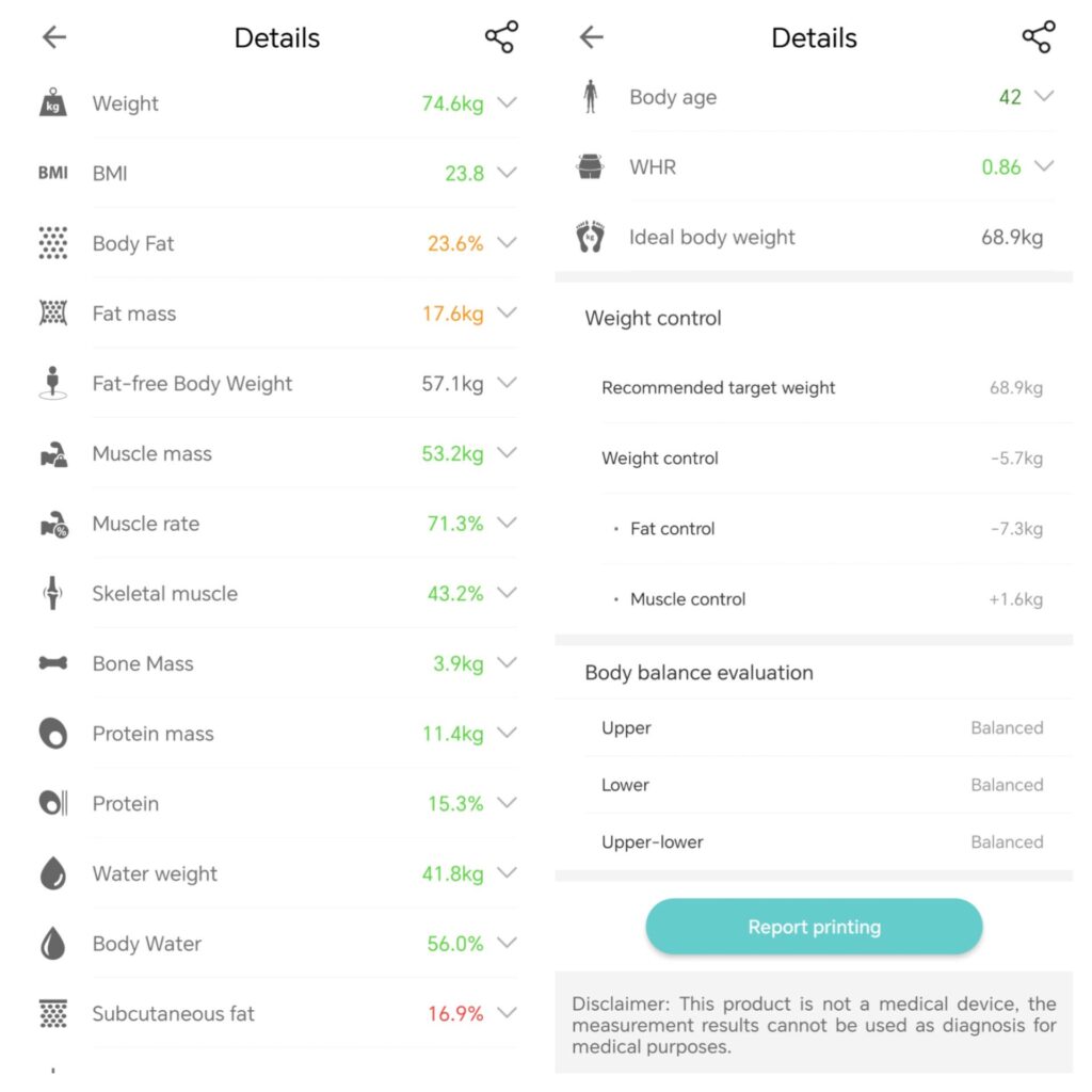 之前做過in-body測試,後來發現淘仔也有相似體脂磅的產品,淘了下來就做了第一次過磅。這就是9月1日的情況:
