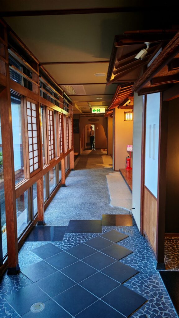 旅館有溫泉浴池,稍微遺憾是風呂較小,的確不是賣點。不過溫泉浴過後在大廳輕鬆打發時間,卻能完全彌補不足,皆因小吃、酒水、甜品都是放題自助式免收費。你可以淺酎清酒,自己調一下Gin Tonic,拿一下花生蝦條,坐在大廳長椅上泡一下足浴,確實自在。