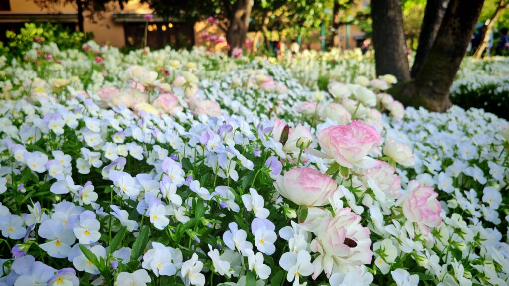 我們黃昏時間到達,先在入黑前逛一圈。由於已是春季,花圃也做了一些時花佈置,以三色堇和羽扁豆最為矚目。