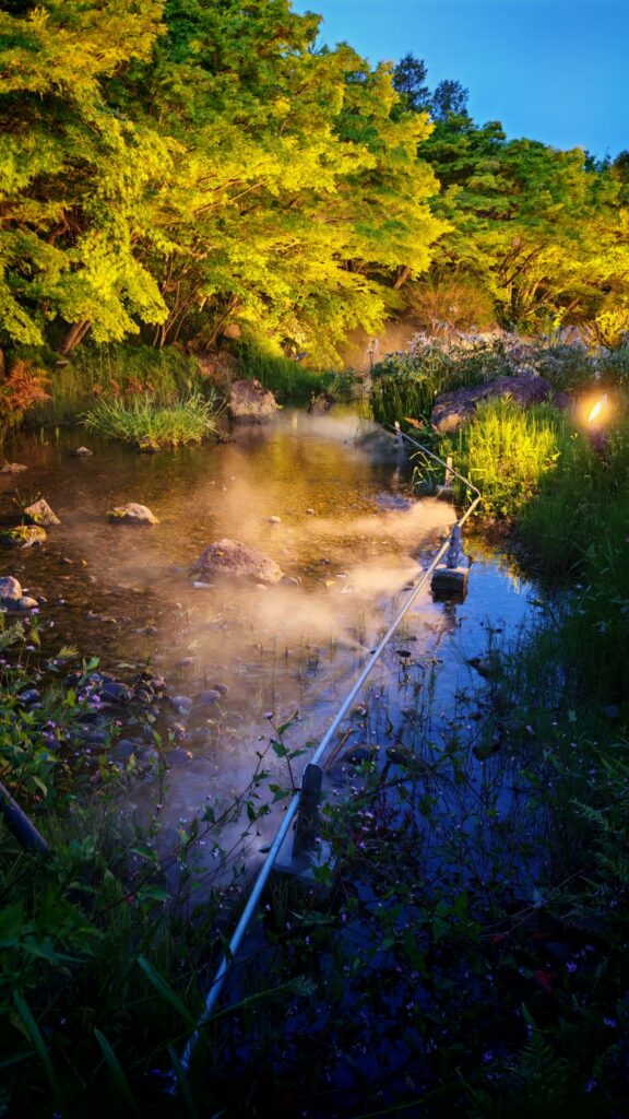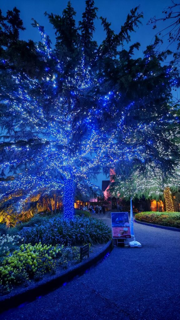 到了入夜,我們再進花園走一圈,確實更漂亮。首先是入口進去左邊的小溪,這時小溪旁的泛黃燈已然亮起,映照到溪邊的楓樹,配以間中噴出來的水霧,塑造出浪漫的迷濛感。三色堇的花園,都佈置了剛才沒注意到的黃綠燈照,背後有歐式小屋作襯景,盡是瑞士或奧地利的小鎮風情。拐個彎有一棵參天大樹,可以想像白天是多麼平凡,到了晚上方知道它從頂到底都纏上了藍色的小燈珠,就是火樹銀花的感覺。