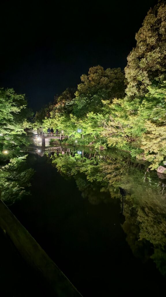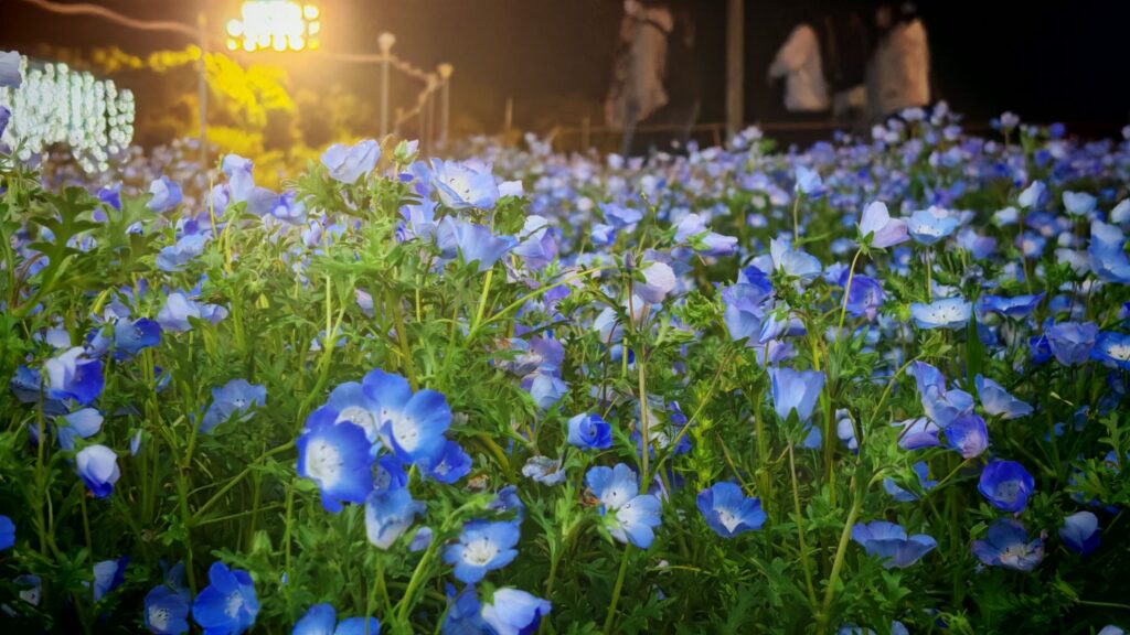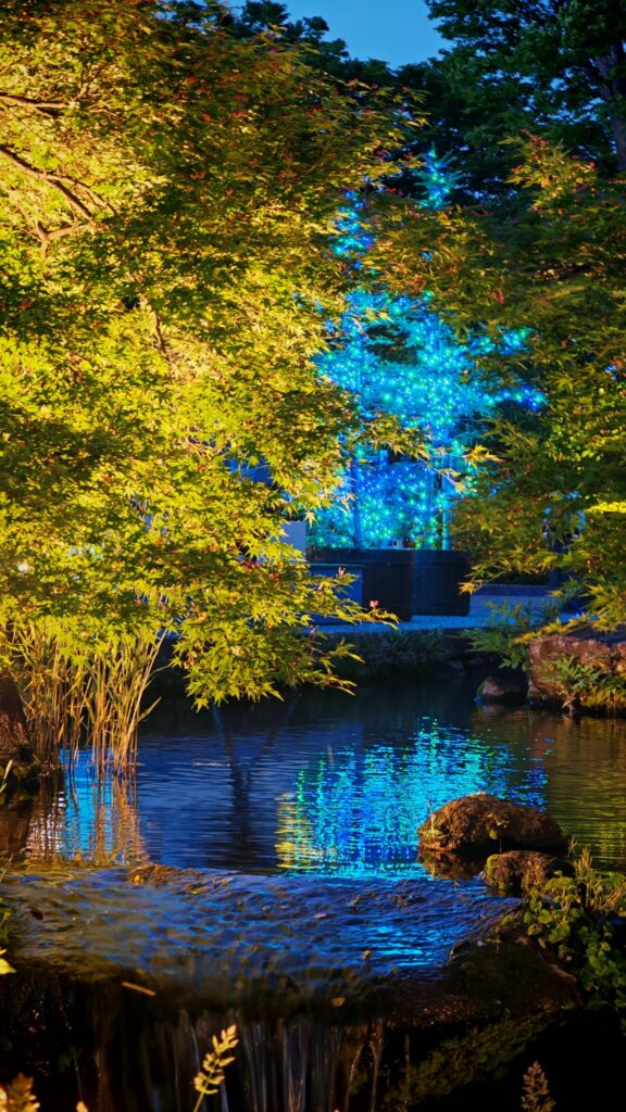 有點可惜的是,來到晚上我們才發現燈光表演場地的另一邊原來是個特大主題花圃,展出大量的藍蝴蝶/粉蝶花。我們在黃昏時段沒進來,完全錯過了這亮點。而鏡池的楓樹和小橋倒影,算是一個小補償吧。