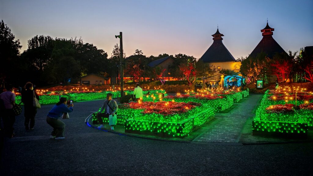 來到長島,還有一個相當值得去的地方,就是名花之里(なばなの里)。它本來就是花圃園藝的打卡熱點,跟北海道的富田農場和四季彩之丘有點相似。唯在每年冬春期間,名花之里都會設立燈光裝置,為全日本最大型的,希望在非花季時段吸引遊人。我們在五月初到訪,剛好趕上賞燈的尾班車。從三井Outlet Park可搭乘巴士到名花之里,班次由15分鐘至1小時一班不等,車程10分鐘左右,可先準備一下行程規劃。