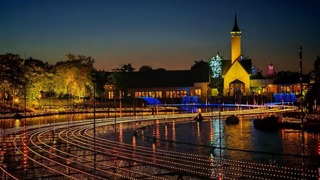 名花之里中央有一個小湖,站到羽扁豆花圃旁的小木橋往西邊望去,遠處就是尖塔頂的小教堂。可見串串燈珠從小教堂那邊延伸過來,有高低差的位置就像瀑布,延展到湖面就成了婉延的路軌。配合從遠至近的亮燈效果,佈局特別令人讚賞。
