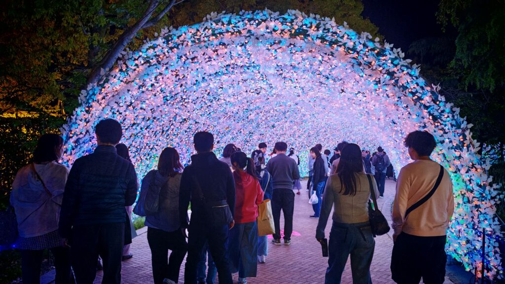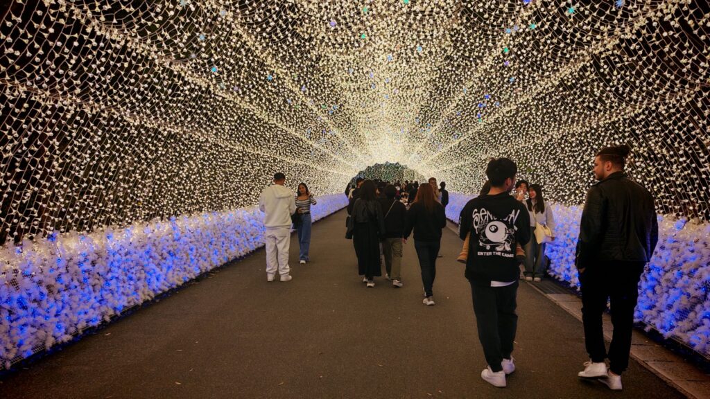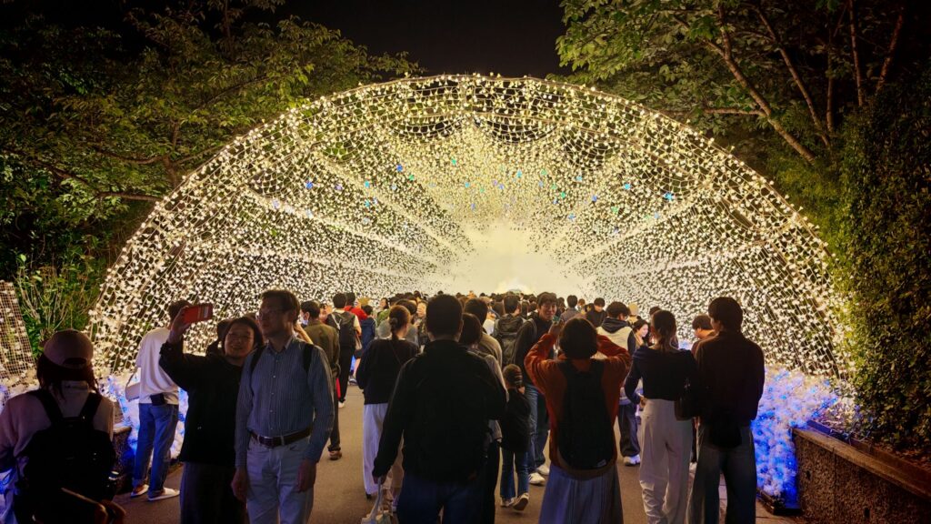 看見人潮漸漸湧到木橋的反方向。咦?剛才白天好像沒發現這條岔路,原來是通往彩燈表演的主場地。今年的主題是「名峰富士」,但未見富士山先見一條長長的光之隧道,名曰「華回道」,足有100米。走在裡面你會感覺到被黃白色的燈串團團包圍,是個不折不扣的打卡位。