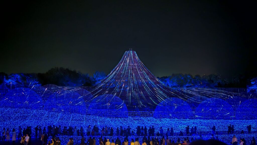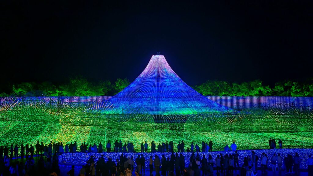 光之隧道的盡頭就是「名峰富士」的場地所在。整個佈局就是一個戶外舞台,搭出約三十米,十米高的燈光棚,上面以燈串砌出富山士的輪廓,而地面的草坪也鋪上串串小燈泡。每場彩燈大概10分鐘,隨著音樂旋律的轉變,燈光串的顏色和亮度就隨之而變化,而且燈光還可以在富士山上造出不同的圖案,確實沒比札幌雪祭的雪雕燈光表演遜色。