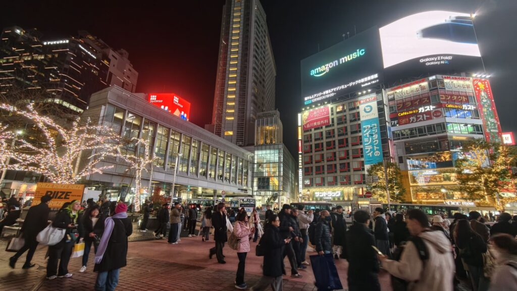 晚飯後經已接近9點半,涉谷著名的道玄坂、神宮通的十字路口仍然人頭湧湧,每次過路燈亮著時總有人在馬路中央停下來打卡,給週邊的高樓和霓燈簇擁絕對是經典的城巿掠影。我們往代代木公園的方向走去,為的是「青之洞窟」聖誕燈飾佈置。
