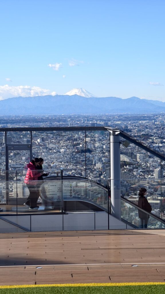 這天天氣特晴,幾乎沒雲,在Shibuya Sky能清晰飽覽東京都的天際線。從新宿到六本木,港區東京灣到淺草下町,在展望台都一覽無遺,東京鐵塔和Sky Tree居然能輕鬆地一起進入相機的畫面之中。更重要的是在能見度極高的情況下,輕易就能看到100公里外的富士山。有點可惜是拍攝的器材不能帶上展望台,否則肯定能拍到更佳的照片。