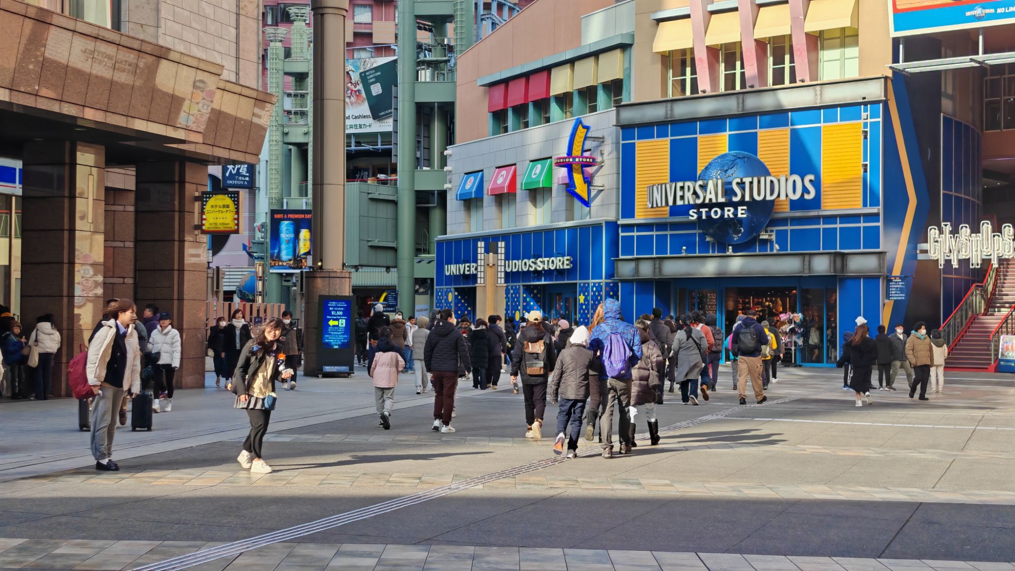 我們十點左右才到USJ。從鐵路站走出來,已被兩旁的週邊產品店吸引著,雖然附近的建築外觀跟新加坡沒大差異,但大量的Mario精品在新加坡是找不到的。見到Yoshi和Boo造型的絨毛帽子,孩子們的心情迅即興奮起來。